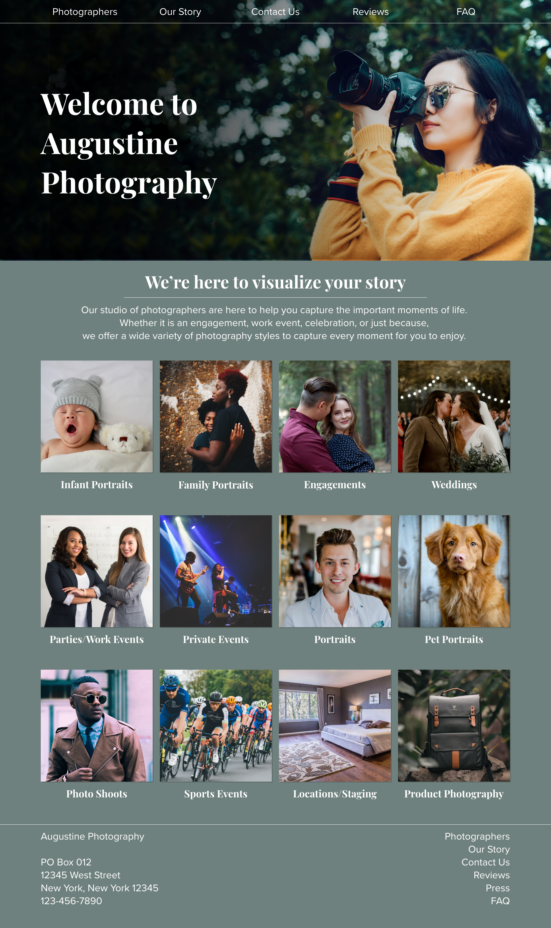 The theme here is a fresh, earthy, and relaxed website with a professional air. By catering to a younger millennial audience, but maintaining a relationship with older generations, the site has a simple yet powerful layout that represents their professionalism and the unique personality of the studio. Capturing the charisma of the studio with examples of various works, the site is able to showcase that professional photography can be personable and fun.