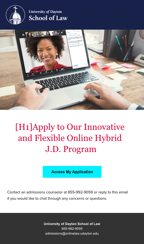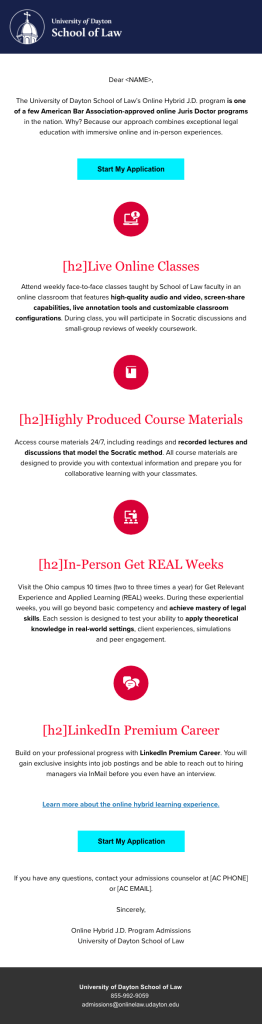 These emails were built to help prospective students along their journey towards pursuing a law degree with University of Dayton’s online law degree program. The emails include steps for moving forward with decisions as well as information about financial aid and inquiries into continued interest. The main focus for these emails was to adhere to the current school branding standards while conveying the information in a fun and informative way.